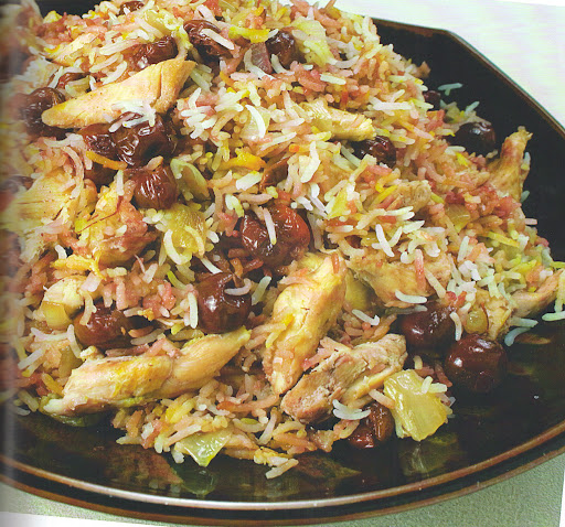 6. Pour saffron water and any remaining cherry juice over rice layers and dot with remaining butter. Don't stir or disturb the pot. Cover with a lid and steam for 35 minutes on low heat until rice is done. Add chicken and steam for an additional 5 minutes.