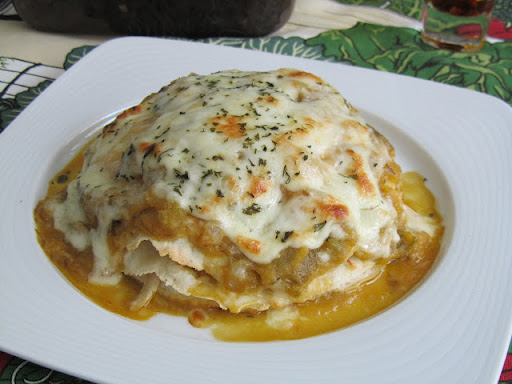 Ponemos otra tortilla por encima y repetimos el proceso: pollo y queso. Cubrimos con la tercera tortilla y rematamos con más salsa y queso por encima. Horneamos durante 20 minutos a 180º C, hasta que se espese la salsa y se gratine el queso. Retiramos del horno y dejamos reposar 10 minutos. Se puede usar el gratinador y retirar cuando el queso esté fundido