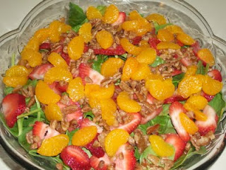Layer spinach strawberries, mandarin oranges and pecans in large bowl. Do two layers if possible or toss items altogether.