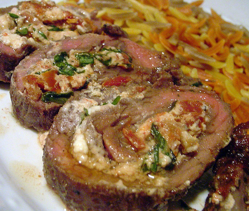 In a bowl, combine the softened goat cheese, sundried tomatoes, basil, a few grinds of pepper. Spread the mixture on top of the flank steak, and then roll it up to form a log. Secure the steak with kitchen twine or toothpicks.