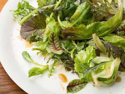 Rub the inside of a large wooden bowl with the garlic clove and then either discard it or save it for another use. Put the mustard in the bowl and whisk in the balsamic vinegar and soy sauce (a French secret!) vigorously for about 10 seconds to get a creamy consistency. Season with salt and pepper, to taste. Drizzle in the olive oil as slowly as possible with 1 hand while whisking as quickly as possible with the other hand to emulsify. Lay the salad greens on top of the dressing and toss just before serving.