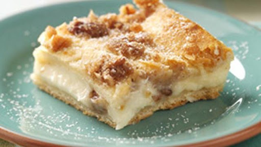 3) In small bowl, mix pecans, brown sugar, butter and cinnamon. Sprinkle half the pecan mixture over the cream cheese layer. On lightly floured surface, press or roll out remaining dough into 13x9-inch rectangle. Place over filling. Sprinkle remaining pecan mixture over top.
