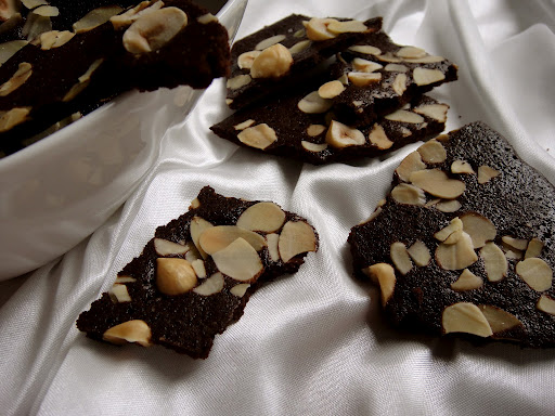 Sprinkle the flax and the nuts into a plastic wrap lined square dish and pour the cocoa syrup on top. Let it chill in the freezer. Cut into four squares.