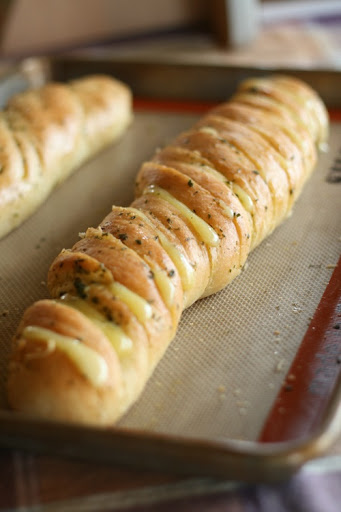 Cut 1-inch slices 3/4′s of the the way through the loaves. Brush garlic butter in between each slice and fill with a slice of cheese. Bake another 3-5 minutes or until cheese is completely melted.