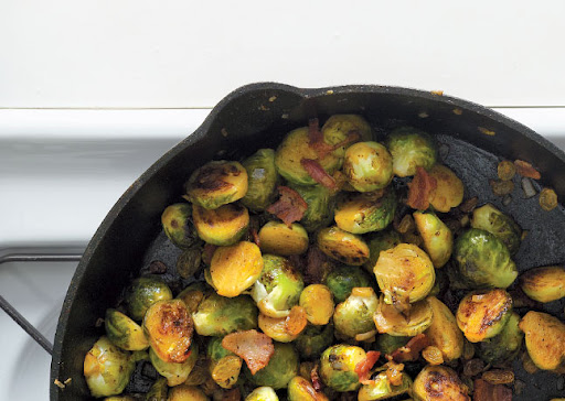 A little bit of bacon and a handful of raisins add a smoky sweetness that balances the slightly bitter flavor of the little cabbages.