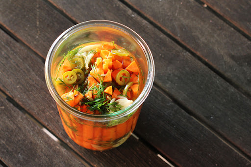 Slice each carrot in half widthwise then in half again lengthwise. Slice each quarter into three wedges. Place carrots into large jar. They should all fit snuggly standing up in the jar.