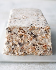 This frozen desert gets its nougatlike texture from egg whites folded into whipped cream. The crunch, meanwhile, is compliments of equal parts caramelized hazelnuts and chpped bittersweet chocolate.