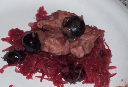 Plate the saurkraut mixture and top with the chicken. Add a cherry on top for garnish.