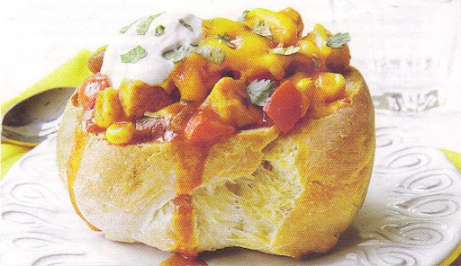 2) Meanwhile, in 4-quart saucepan, heat oil over medium-high heat. Cook chicken, onion and bell pepper in oil 5 to 7 minutes until chicken is no longer pink in center. Stir in remaining ingredients except cheese and additional sour cream. Heat to boiling; reduce heat. Simmer about 7 minutes until hot. With sharp knife, cut small portion off top of each loaf. Lightly press center of bread down to form bowl. Fill each with 1 cup chicken mixture; top with cheese and sour cream.