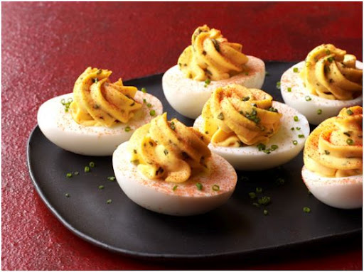 Halve lengthwise and scoop out the yolks; mash with milk, mayonaise, mustard powder, chopped parsley, chives and tarragon, and salt and pepper.