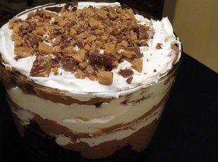 2 In a large glass bowl, layer the bottom with a third of your cake cubes. Then sprinkle with 1/3 Kahlua. Top with a layer of pudding, then a layer of Cool Whip. Then a layer of candy.