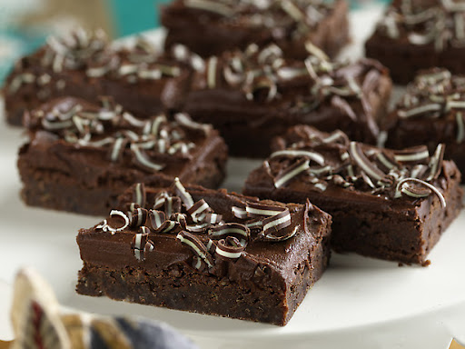 Remove pan from the oven and allow brownies to cool in pan on wire rack. Spread with chocolate frosting. Top with shaved mint thins.
