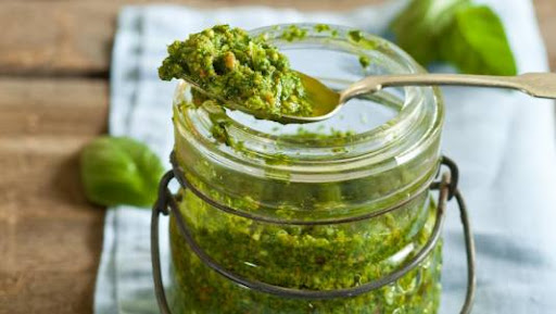 Place garlic in food processor; pulse until chopped. Add pistachios, basil, lemon juice and salt; pulse until nuts are finely chopped. Add olive oil gradually through food chute and process until well combined. Add cheese and pulse 2 or 3 times.