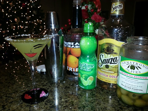Pour first four ingredients into shaker. Mix well. Add salt on rim of martini glass. Add ingredients into glass and top off with a little bit of olive juice, an olive, and ENJOY!