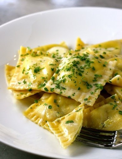Bring a large pot of salted water to a boil. Working in batches, add the ravioli and cook for 4 to 5 minutes, until the ravioli float to the top. Using a slotted spoon, transfer the ravioli to a serving platter. Finish cooking the rest of the ravioli.