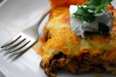 1. Cook the chicken in the olive oil on medium, adding 2 teaspoons of lime juice, 2 teaspoons of ancho chile powder and salt to taste. 2. When chicken is done (after about 20 minutes), shred it with two forks and set aside. Should yield about 3 cups. 3. Melt the butter in a saucepan on medium, and add the onions, red bell pepper and poblano pepper. Cook for 10 minutes. 4. Add the garlic, flour, cumin, cayenne pepper and 2 teaspoons of ancho chile powder, and cook for 1 minute. 5. Add the chicken broth and cook on low until mixture is thickened, a few minutes. Stir in the half-and-half and Ro-Tel cover the pot, and simmer for about 15 minutes, stirring occasionally. 6. Uncover the pot, and add the sour cream, 2 teaspoons of lime juice and 1/4 cup of cilantro, and add salt and pepper to taste. Turn off heat. 7. Preheat the oven to 350 degrees. 8. Heat up the tortillas (you can do this by adding a bit of oil on an iron skillet and then cooking the tortillas for about 30 seconds on each side). 9. Ladle 1/2 cup of the sauce onto the bottom of an 11 x 7 inch baking pan. 10. Layer half the tortillas along the bottom of the pan (on top of the sauce). To make sure entire pan is evenly covered, you can rip some of the tortillas into strips to fill any gaps. 11. Add half the chicken, half the remaining sauce, half the remaining cilantro and 1 1/2 cups of grated cheese. 12. Repeat the layering, leaving the cheese layer on top. 13. Cook uncovered for 30 minutes or until brown and bubbling. Serves 6-12, depending on how big a portion you distribute. Goes great with sour cream and cilantro on top.
