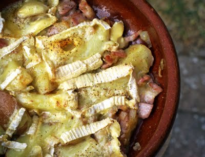 4) Using a sharp knife, score both sides of the cheese rounds in a diamond pattern by making shallow diagonal cuts at 1-inch intervals. Cut rounds in half horizontally, then in half crosswise. Arrange cheese, rind side up, on top of potato mixture.