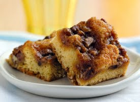 In medium bowl, mix brown sugar, caramel topping, melted butter, pecans and cinnamon. Drop by spoonfuls on top of batter, and spread evenly.