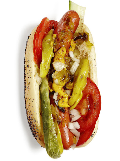 - Serve boiled hot dogs on poppy-seed buns with dill pickle and cucumber spears, sliced tomatoes, sweet pickle relish, pickled peppers, diced onion and yellow mustard. Sprinkle with celery salt.