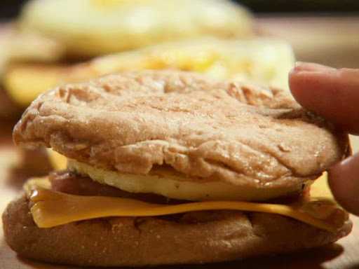 Lay out the muffins in a row with the bottoms down and the tops ready to go on. Lay a slice of cheese on each. Lay a slice of ham on each. Lay an egg on each. Put the tops on. Immediately wrap them in a foil bag to lock in the heat.