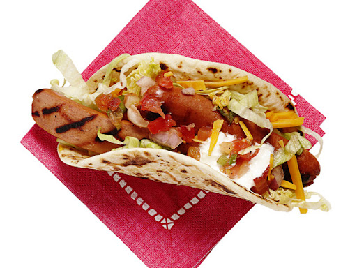 - Wrap grilled halved hot dogs in grilled flour tortillas; top with shredded cheddar, lettuce, salsa and sour cream.