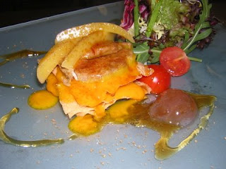 Hojas de pasta + puré de mango + rodaja de 30 gr de foie + hojas de pasta + Puré de mango + rodaja de foie de 30 Gr + tres láminas de mango en almíbar.