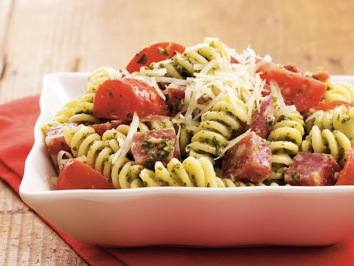 2) In large bowl, toss hot pasta with pesto, tomatoes and salami. Sprinkle with cheese.