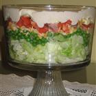 In a large flat bowl, place the chopped lettuce and top with a layer of onion, peas, shredded cheese, cauliflower and bacon.
