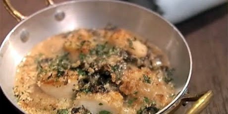 To assemble the dish: Heat the oven to broil with the rack at the top. Lay 6 large scallop shells or individual gratin dishes on a baking sheet. Divide the mushroom mixture among the shells. Arrange six scallops on each, then spoon over the sauce. Add topping (see instructions) and broil until golden and bubbly, 2 to 3 minutes. Serve immediately.
