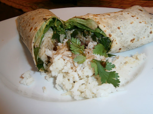 1 large leaf of Lettuce, rice, greens, drizzle of marinade, beef, pepper flakes, cilantro and finally 1 more small leaf of lettuce.