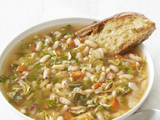 Combine the carrots, celery, cabbage, pancetta, beans, tomato paste, parmesan rind, 1 teaspoon salt, 1/2 teaspoon pepper and 7 cups water in a 5-to-6-quart slow cooker. Cover and cook on low, 7 to 8 hours. Leave 1 slice of bread at room temperature to dry out slightly.