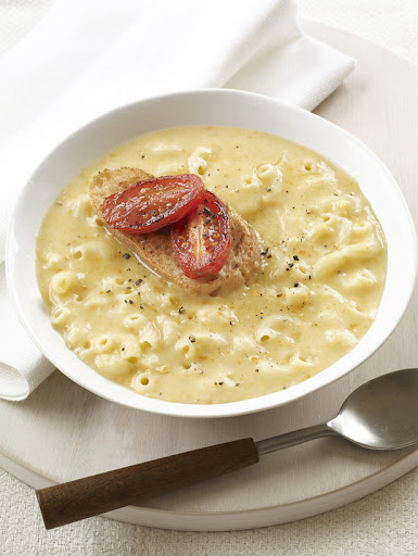 4) Add the milk, cheeses and macaroni and stir until the cheeses melt. Season with pepper. Top the toasts with tomatoes; serve on the soup.
