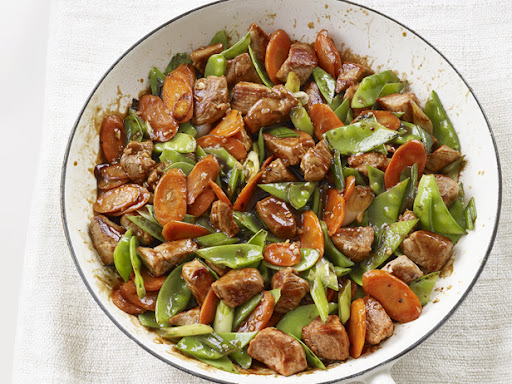 3) Heat the remaining 1 tablespoon peanut oil in the skillet, then stir-fry the garlic with a pinch each of salt and sugar, 15 seconds. Add the carrots and scallions and stir-fry until crisp-tender, 2 minutes. (Add a little water if the garlic starts to stick to the skillet.) Add the pork, snow peas and soy sauce mixture; stir until the pork is cooked through and the sauce is thickened, about 3 minutes.