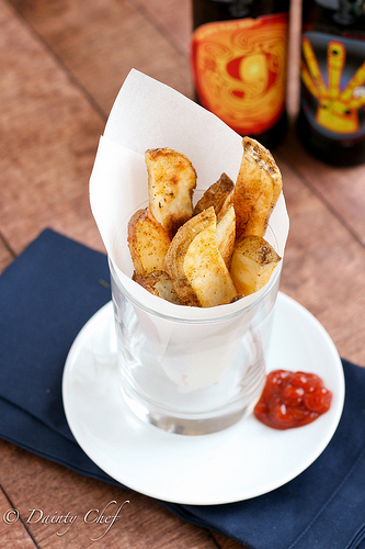 Pre-heat oven to 400 degrees. Line a baking sheet with parchment paper & set aside. Cut each potato in half lengthwise, halve again, and slice each quarter into ¼-inch-thick strips. Try to make even cuts so that you prevent uneven cooking. Soak in cold water for 30 minutes, then dry thoroughly with paper towels.