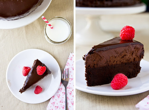 Make the cake:Preheat oven to 350. Line the bottom of a 9-inch sprinform pan (outside wrapped with a triple layer of foil to protect from leaks in the waterbath) with a parchment round and lightly spray the bottom/sides with baking spray. Melt the butter and chocolate in the microwave in a large bowl, on 30-second intervals until melted. Whisk in the eggs and sugar until well combined. Stir in the vanilla and liqueur and then pour the batter into the prepared pan. Place the pan in a larger pan (like a 13x9) and fill the larger pan with enough hot water to come up level with the batter. Bake 35-40 minutes, until firm to the touch, and then remove from the oven (but let cool completely in the waterbath). After the cake cooled, I cut ~4-inch wide strips of parchment and lined the sides of the springform pan, pushing the parchment down between the cake and sides (shrinkage made this possible). This helped with removal later. Make the mousse:Melt butter and chocolate in the microwave, stirring until smooth; set aside to cool. Whisk the yolks, sugar, and vanilla together until smooth and then whisk in the chocolate mixture. Using a mixer, whisk the whites until stiff peaks form. Fold the egg whites in 3 batches into the chocolate. Once an addition is almost completely incorporated, add the next. The texture will look completely questionable but keep going. It gets better. Place the cream into the mixer bowl and whip that just until soft peaks start to form. Fold the whipped cream into the mousse mixture until the texture is uniform - you'll fold this much, much more than a more traditional mousse. Spread the mousse over the cooled cake, wrap the top with foil, and freeze overnight (at least 6 hours). Make the glaze:In a small sauce pan, bring corn syrup and cream just to a boil. Turn off the heat and add the vanilla and chocolate. Whisk until smooth and then let sit in the pan for 30 minutes to cool and thicken. Remove the cake from the freezer and turn it out onto a rack set on a baking sheet or on a cake plate, mousse-side on top - remove the ring and peel off the parchment sides. Pour the glaze into the center of the cake, letting it flood the top and run down the edges (it won't cover the sides completely). I put the cake in the fridge to set the glaze and then cut pieces for the freezer. To freeze the whole cake, chill the cake to set the glaze and then wrap with plastic wrap and freeze. The cake is recommended as best-served just minutes out of the freezer.