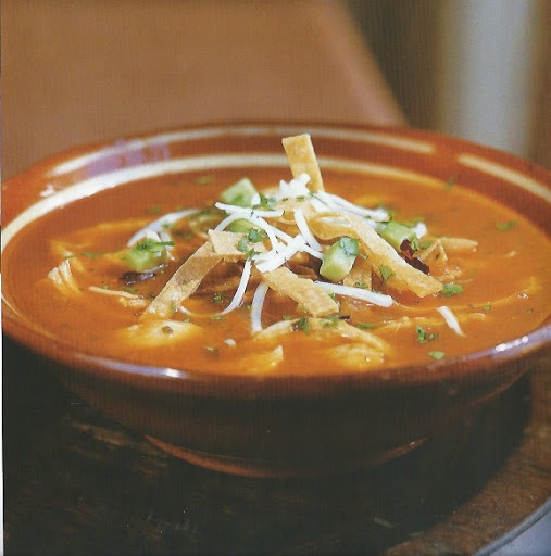 To serve, ladle the soup into warmed bowls. Dived the tortilla strips, crumbled chile, the 1/4 cup cilantro, the avocado, cheese, and lime juice evenly among the bowls and serve immediately.