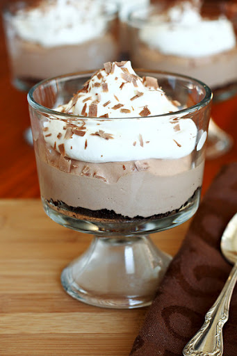 In a medium bowl, stir together the Oreo cookie crumbs and melted butter. Evenly divide the crumbs between 6 individual serving dishes. Press into the bottoms of the dishes to form a crust. With an electric mixer, beat the cream cheese and Nutella until smooth. Stir in vanilla. Fold old in the whipped topping until well blended. Divide the filling evenly among the individual dishes. Cover with plastic wrap and refrigerate for at least 2 hours before serving. Just before serving, If desired, garnish with whipped topping and chocolate shavings.