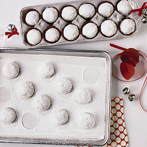 To Wrap: An egg carton provides protection for light and crumbly snowballs. Snip off the carton lid, nestle the cookies in paper candy cups, and wrap the whole thing in a sheet of cellophane, Tootsie Roll-style.