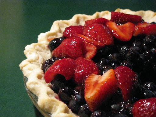 Raw berries mixed with melted fruit spread in a pre-baked pie shell.