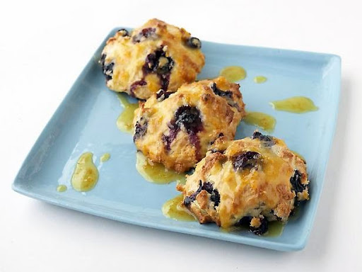 Sift together the dry ingredients; the flour, baking powder, salt, and sugar. Using 2 forks or a pastry blender, cut in the butter to coat the pieces with the flour. The mixture should look like coarse crumbs. Make a well in the center and pour in the heavy cream. Fold everything together just to incorporate; do not overwork the dough. Fold the blueberries into the batter. Take care not to mash or bruise the blueberries because their strong color will bleed into the dough.