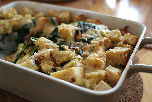 Increase heat to medium-high and cook shallot and garlic, stirring constantly, until golden, about 1 minute. Gradually add arugula and cook, stirring, until it wilts. ►Stir arugula mixture, bacon, bread, and cheese into custard.