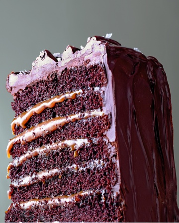 Preheat oven to 350 degrees. Make the cake: Butter three 9-inch round cake pans, and dust with flour, tapping out excess. Sift flour, granulated sugar, cocoa, baking soda, baking powder, and 1 1/2 teaspoons course salt into the bowl of a mixer. Beat on low speed until just combined. Raise speed to medium, and add eggs, buttermilk, 1 1/2 cups warm water, oil, and vanilla. Beat until smooth, about 3 minutes.
