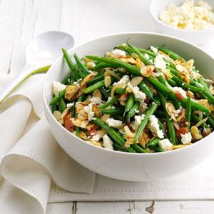3. Add green beans and almonds; cook and stir 3-4 minutes or until beans are crisp-tender. Sprinkle with lemon peel, lemon juice, salt and pepper; toss to combine. Top with cheese. Yield: 6 servings.