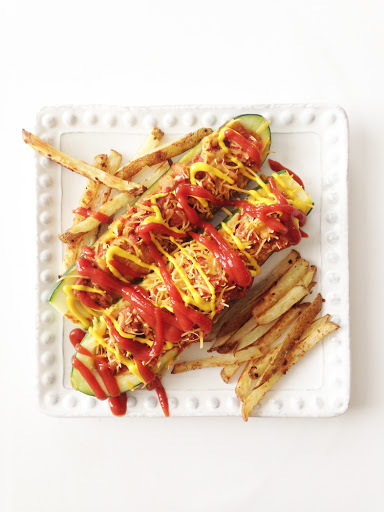 Clean, cut the stems off of your zucchini and slice them in half. Using a spoon or melon baller, scoop out the pulp and flesh to leave about 1/4" thick 'shells'.