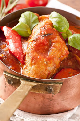 Transfer the chicken to a plate and set aside. Add the bell pepper, onion and garlic to the same pan and saute over medium heat until the onion is tender, about 5 minutes. Season with salt and pepper. Add the wine and simmer until reduced by half, about 3 minutes. Add the tomatoes with their juice, broth, capers and oregano. Return the chicken pieces to the pan and turn them to coat in the sauce. Bring the sauce to a simmer. Continue simmering over medium-low heat until the chicken is just cooked through, about 30 minutes for the breast pieces, and 20 minutes for the thighs.