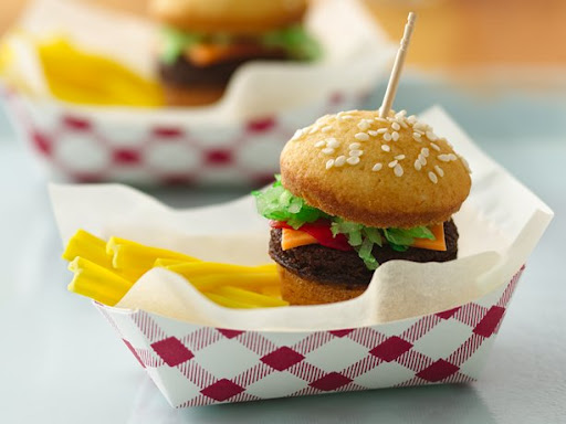 For a fun touch, serve these“sliders”in red and white checked paper food trays, like at a fast-food restaurant, accompanied by“fries”(yellow licorice twists).