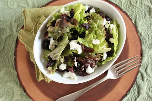Toss the torn greens with the dried cranberries and crumbled goat cheese.