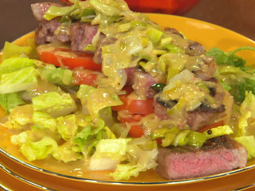 On each dinner plate, arrange a bed of shredded romaine and thickly sliced tomatoes. Slice meat against the grain of the steak. Arrange the steak over the sliced tomatoes. Scatter the leeks over the sliced steaks and pour bacon dressing down over the top.