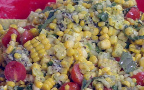 Sides (Grilled Corn & Tomato-Sweet Onion Salad with Fresh Basil Dressing & Crumbled Blue Cheese)