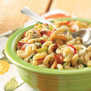 Drain macaroni. In a large bowl, combine the macaroni, onion and celery. Drizzle with vinegar mixture. Add mushrooms and bacon; toss to coat. Garnish with radishes and parsley.